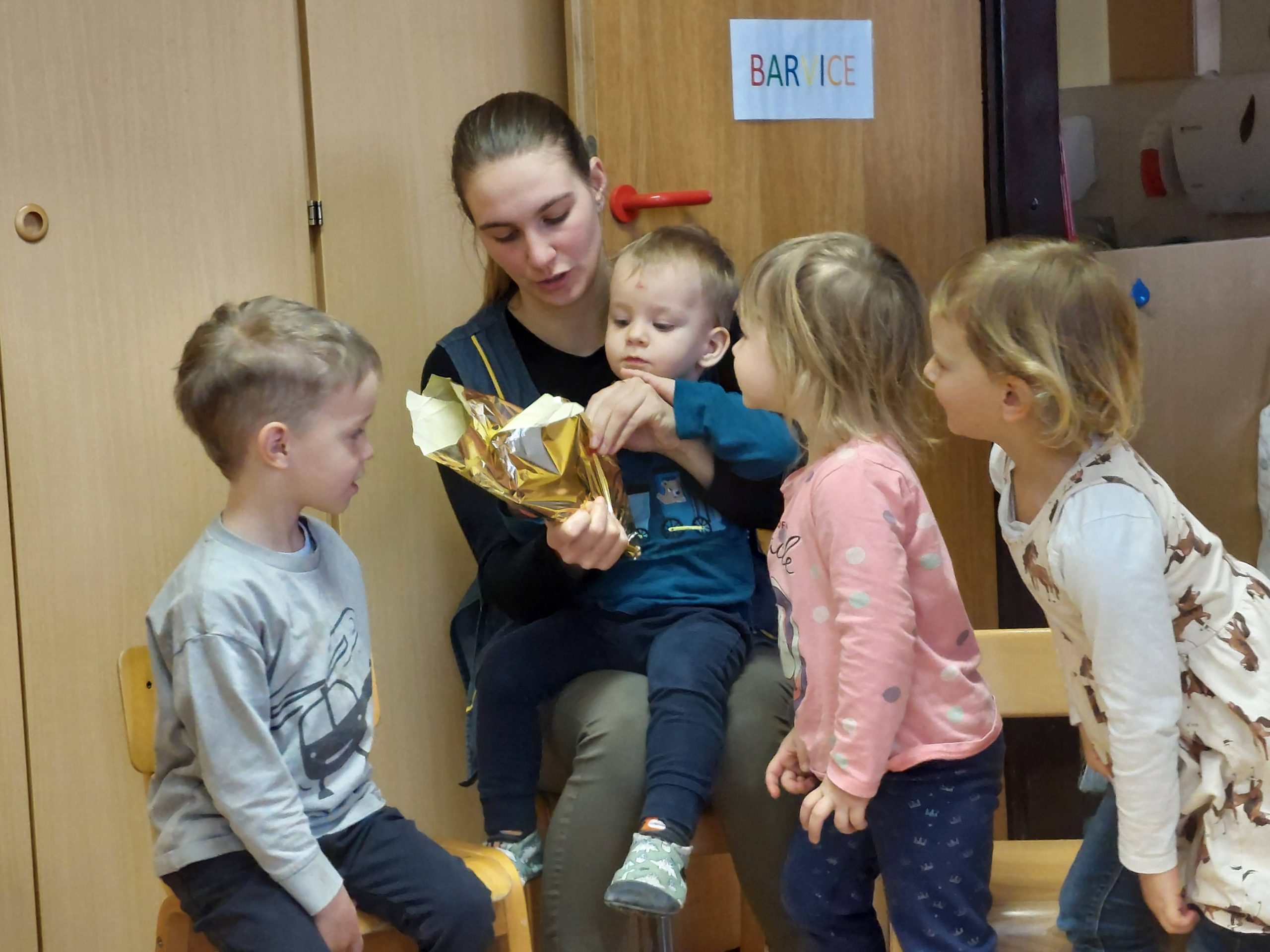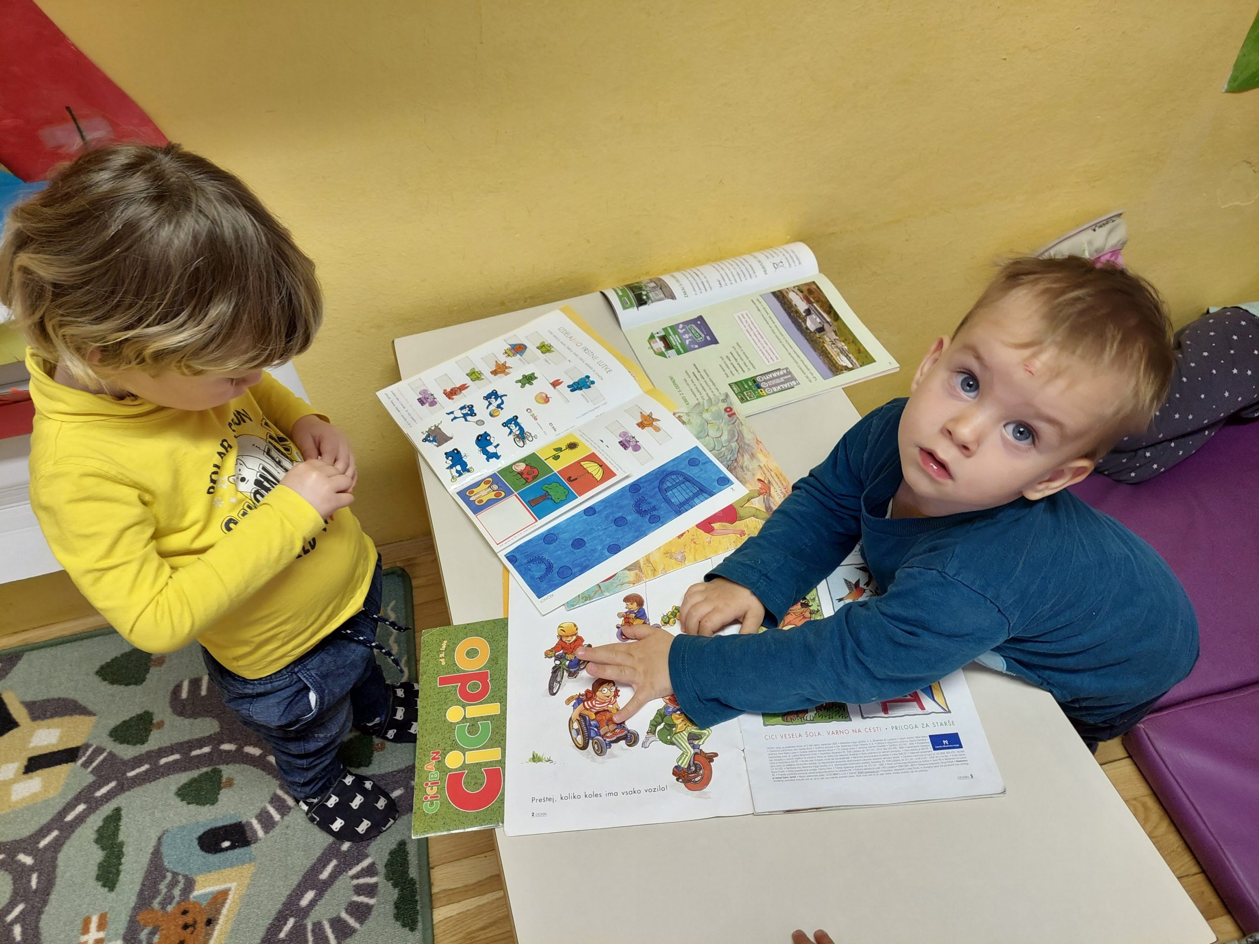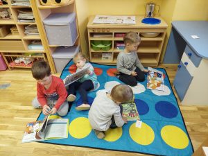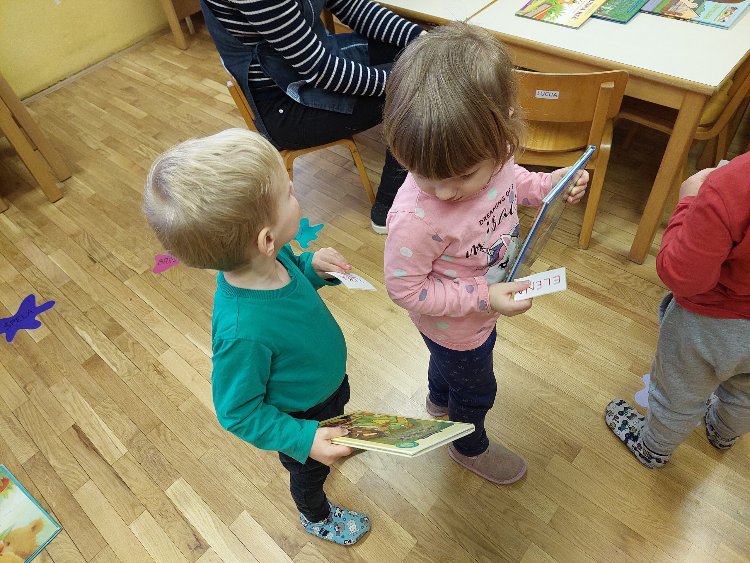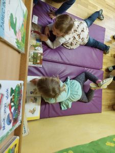 Letos nam je poštar prinesel paket, za katerega smo hitro ugotovili komu je namenjen, nismo pa vedeli kaj je v njem. Po natančen ogledu, tipanju, tresenju in še bi lahko naštevali 🙂 smo sklenili, da paket odpremo. V njem sta bili dve knjigi in seveda smo obe prebrali. Otroke je knjiga Čudna reč popolnoma posrkala in želeli so jo večkrat poslušati. V nadaljevanju dopoldneva se je vse vrtelo okrog knjig. Otroci so se igrali igro vlog V knjižnici, zadrževali so se v kotičku za risanje in pisanje, prebirali knjige na blazinah. Vse je potekalo zelo umirjeno, otroci so se sami dogovarjali kdaj se bodo zamenjali po kotičkih. Ob igri so se tako navajali na spoštljiv odnos do knjige, ob branju pa doživljali ugodje, zabavo in spoznanje, da so knjige prave zakladnice idej in zgodb.