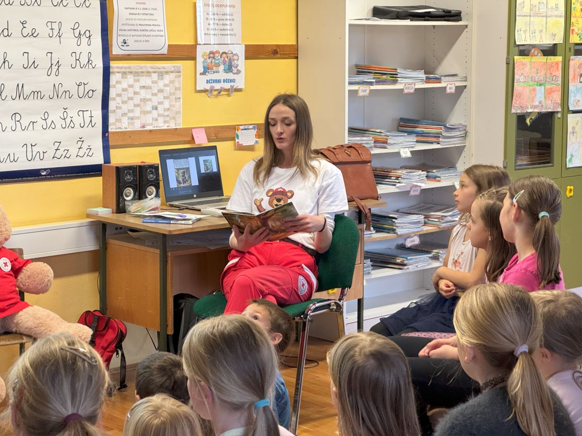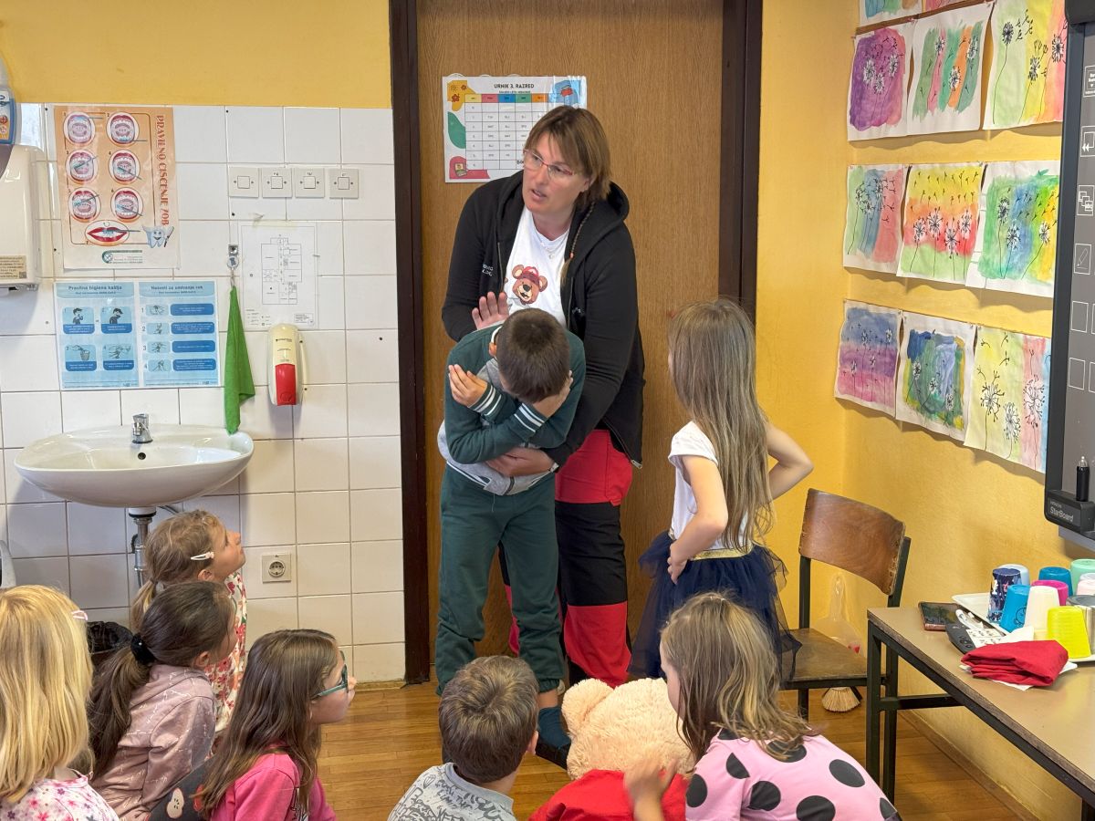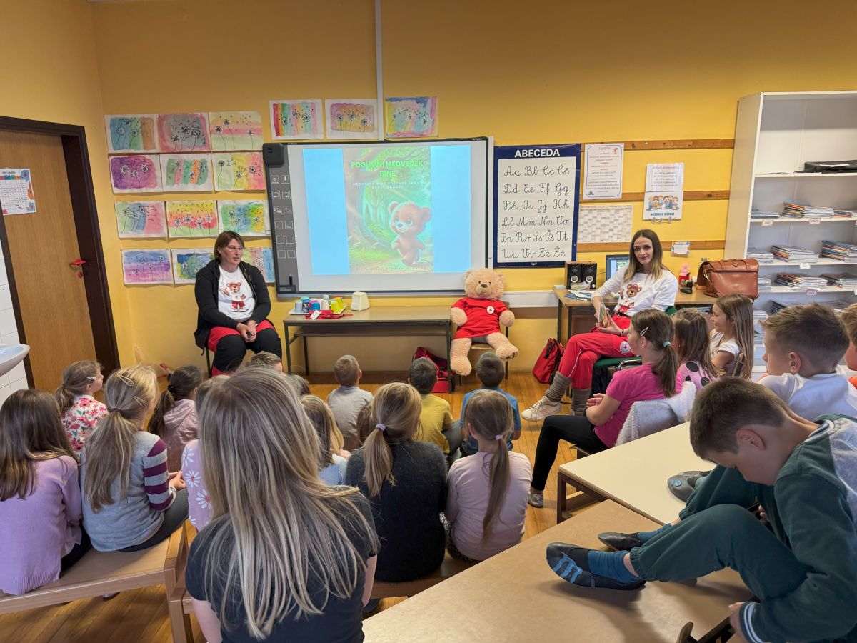 Mlajši učenci smo poslušali tudi pravljico o nerodnem medvedku Binetu in se naučili veliko novega o nudenju prve pomoči.