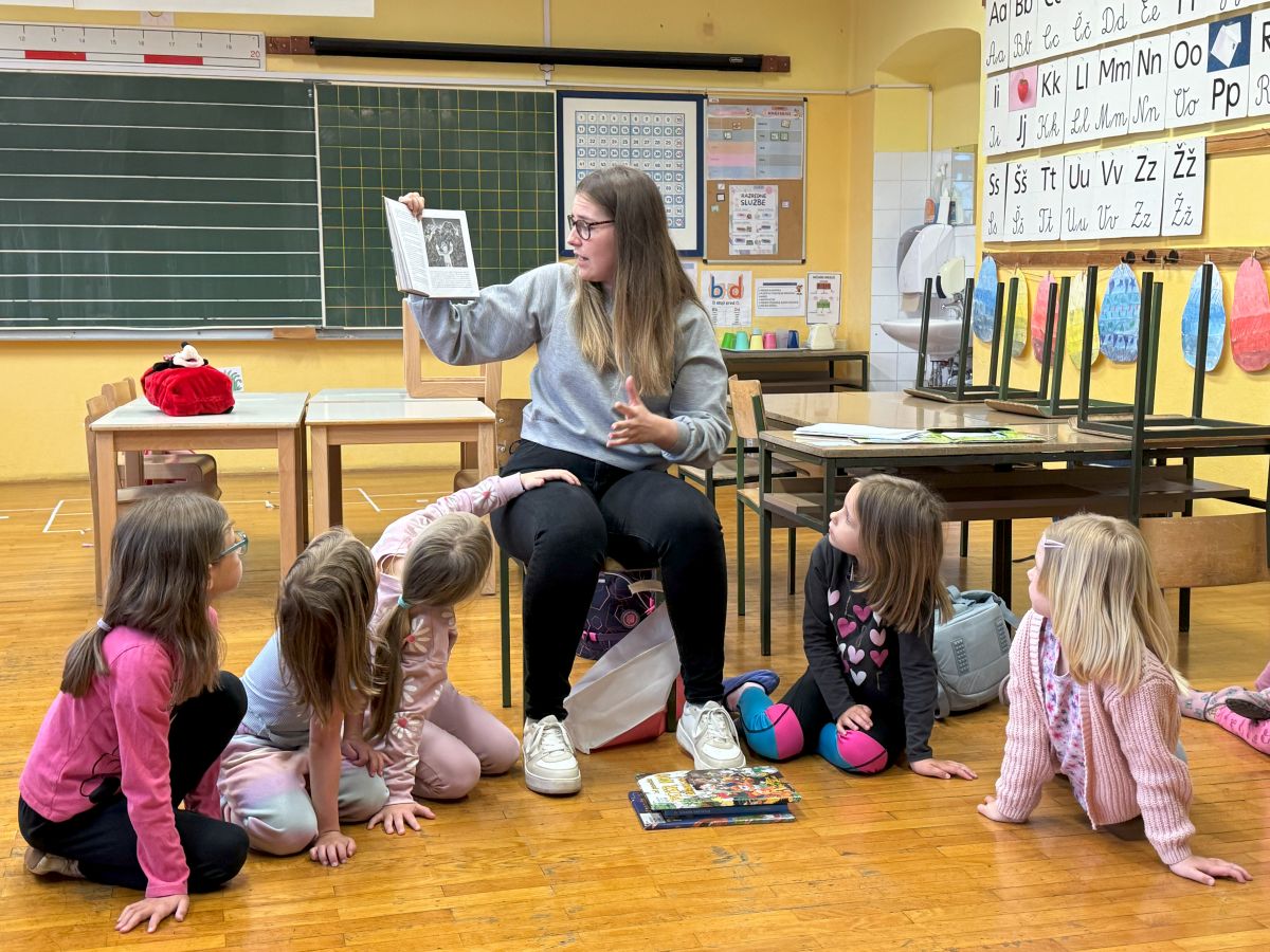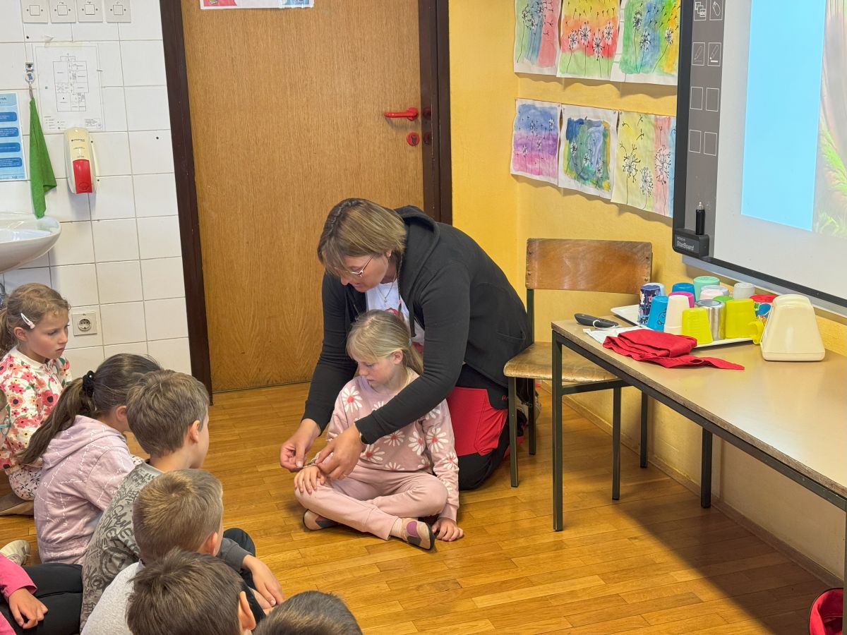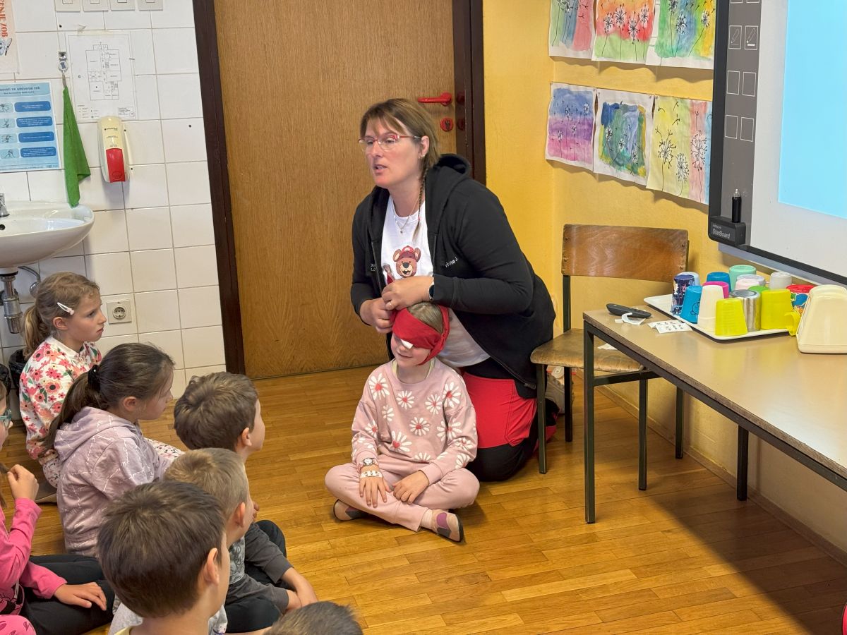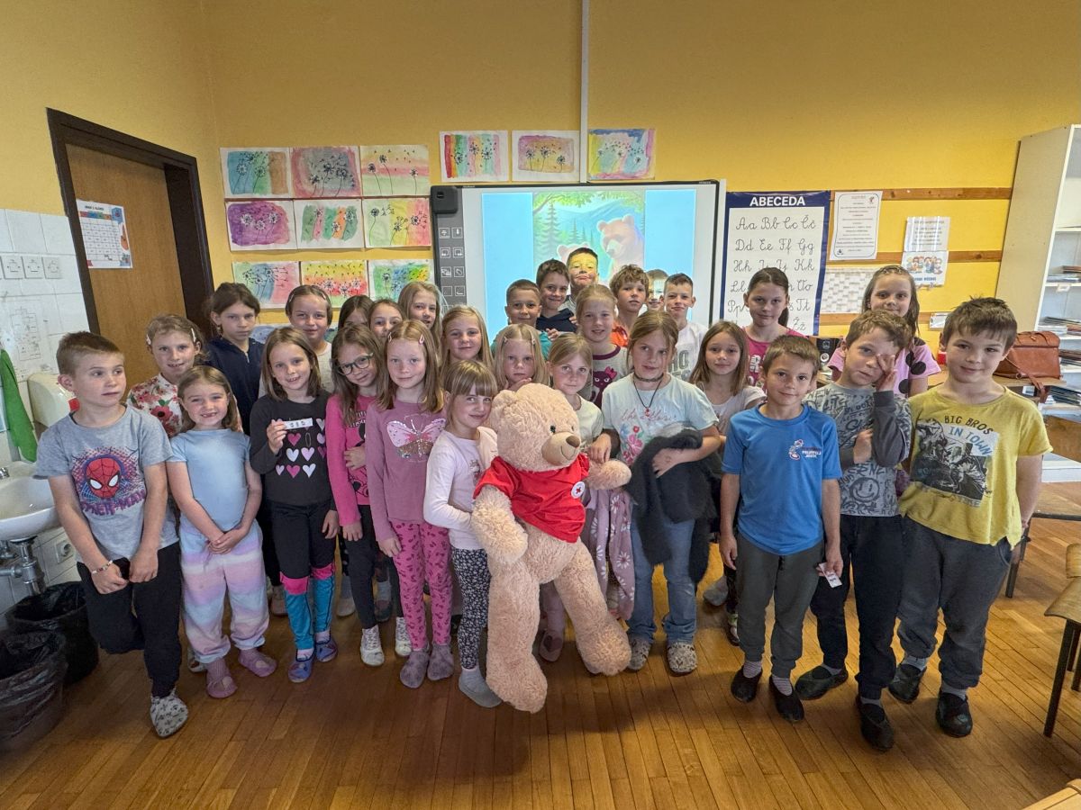 Mlajši učenci smo poslušali tudi pravljico o nerodnem medvedku Binetu in se naučili veliko novega o nudenju prve pomoči.