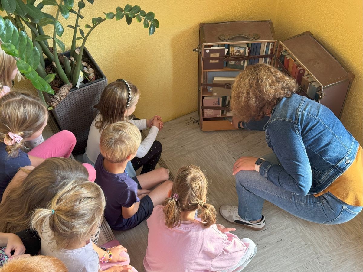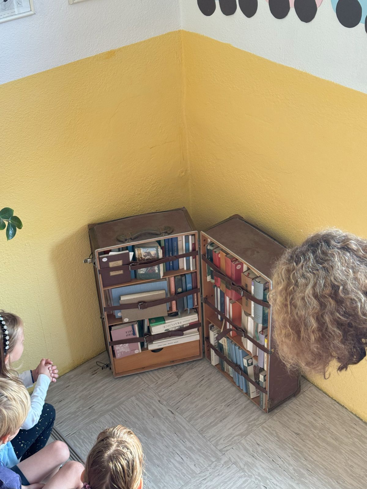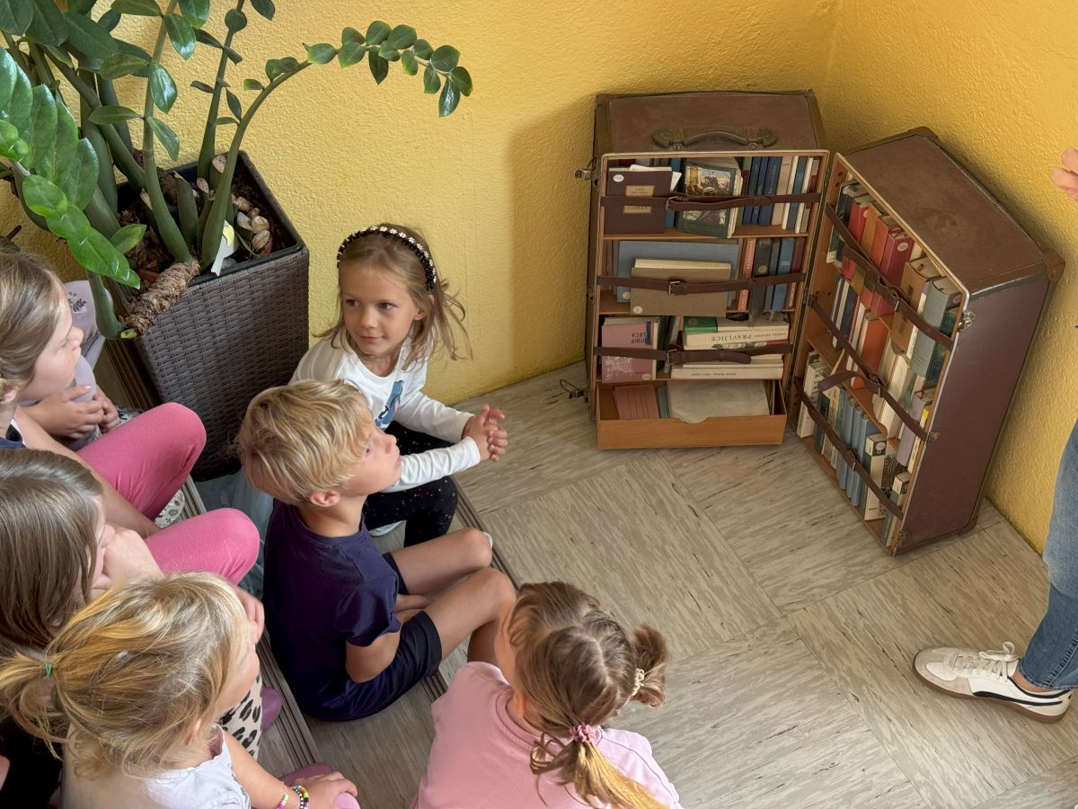 17. septembra, na dan zlatih knjig, dan rojstva in smrti Franceta Bevka, smo prvošolci spoznali gibanje Bralna značka, ki mlade bralce spremlja že 65 let. Vsi prvošolci so letošnje leto dobili darilno slikanico Slavka Pregla O dečku, ki je imel rad ptičke. Iskali smo jo po vsej šoli in jo nazadnje našli na stopnišču ob velikem starem kovčku. Zanimalo nas je, kaj se v kovčku skriva in odkrili smo potujočo knjižnico. Ta knjižnica je dragocen spomin na stare čase, ko je kovček potoval po okoliških vaseh in v domove prinašal dragoceno branje. Res smo ponosni, da se kovček še vedno hrani na naši šoli.