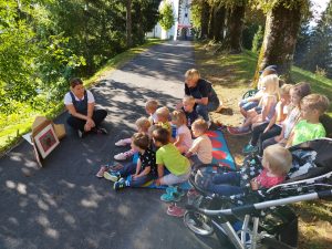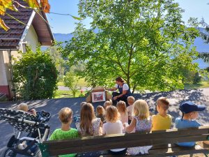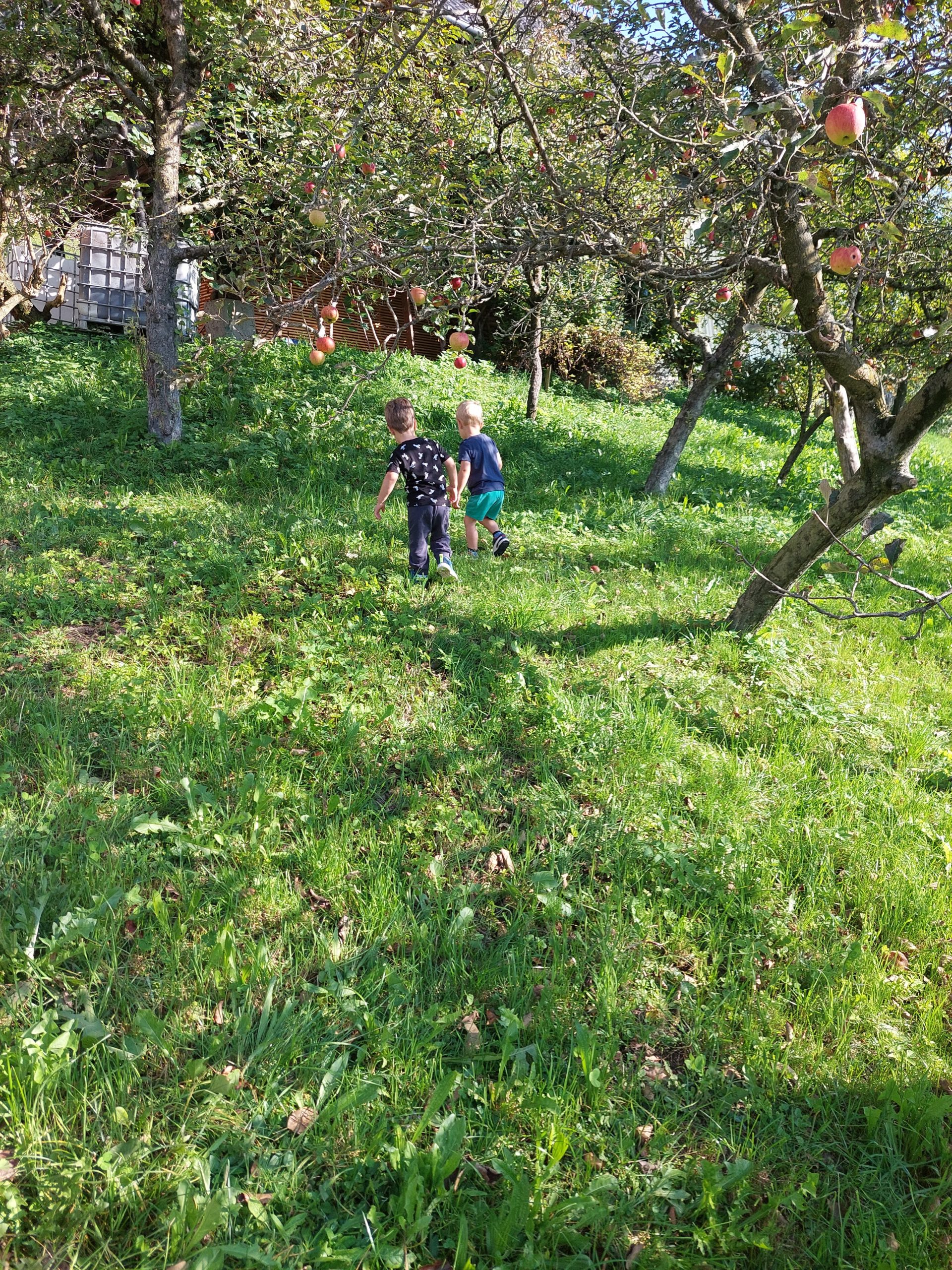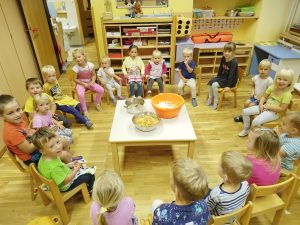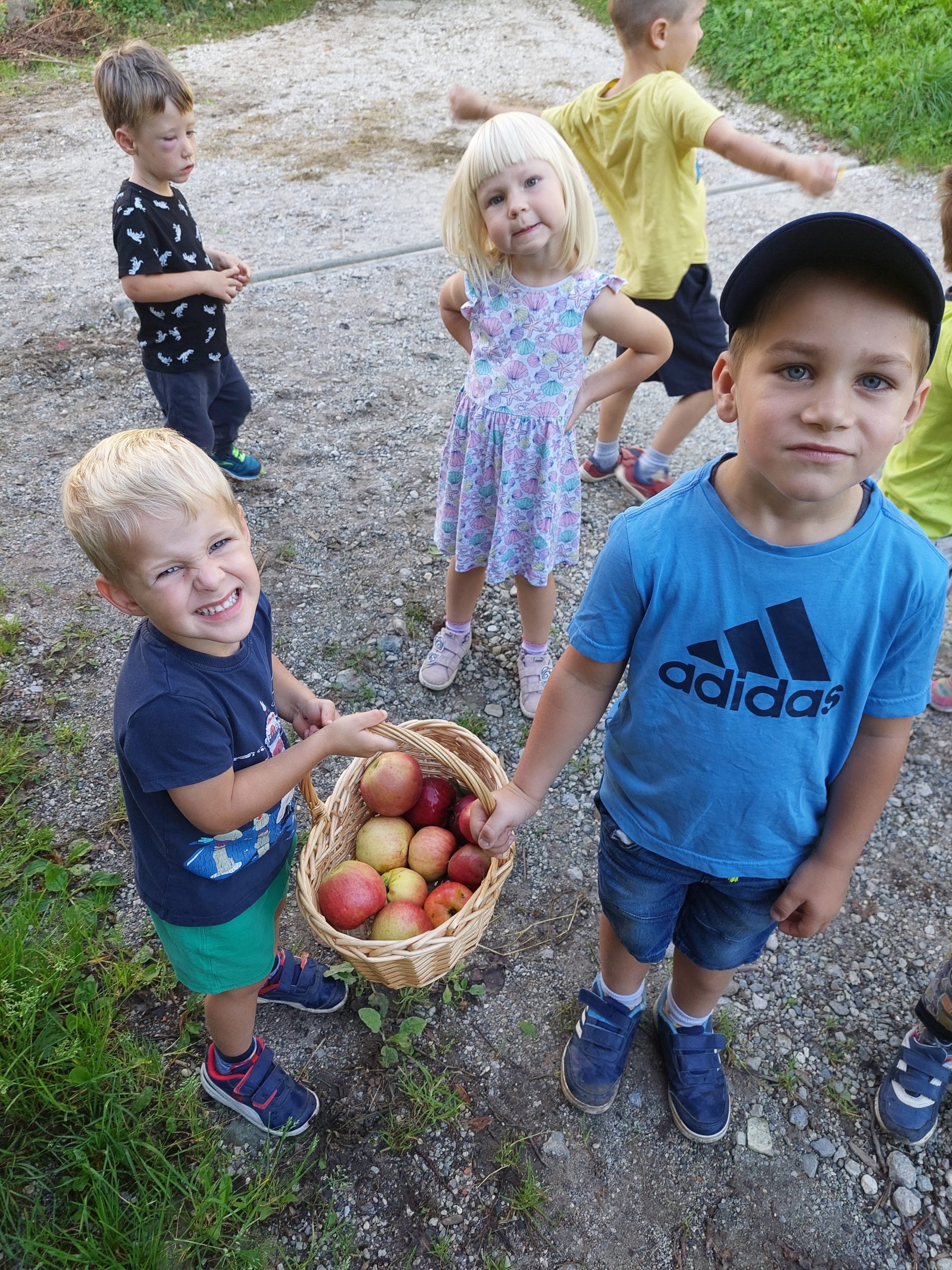 V ponedeljek, 22. septembra smo v skupini Kapljice in Mehurčki obeležili prvi jesenski dan. Vreme nam je popolnoma služilo, da smo se lahko podali v naravo, kjer smo pod velikimi, mogočnimi kostanji prisluhnili kamišibaj pravljici Mala miška in veliko rdeče jabolko. Deklamirali smo deklamacijo o Jabolku, ki jo nekateri otroci že zelo dobro poznajo. Odločili smo se, da se tudi mi odpravimo in poiščemo jabolka. Otroci so pozorno opazovali, kje se nahajajo jablane z jabolki. Našli in nabrali smo jih polno košaro in jih odnesli s seboj v vrtec. Tekom tedna smo jabolka tipali, okušali, vonjali, jih primerjali po velikosti, razvrščali, odtiskovali in pripravili pravi jesenski sladoled in se z njim posladkali.
