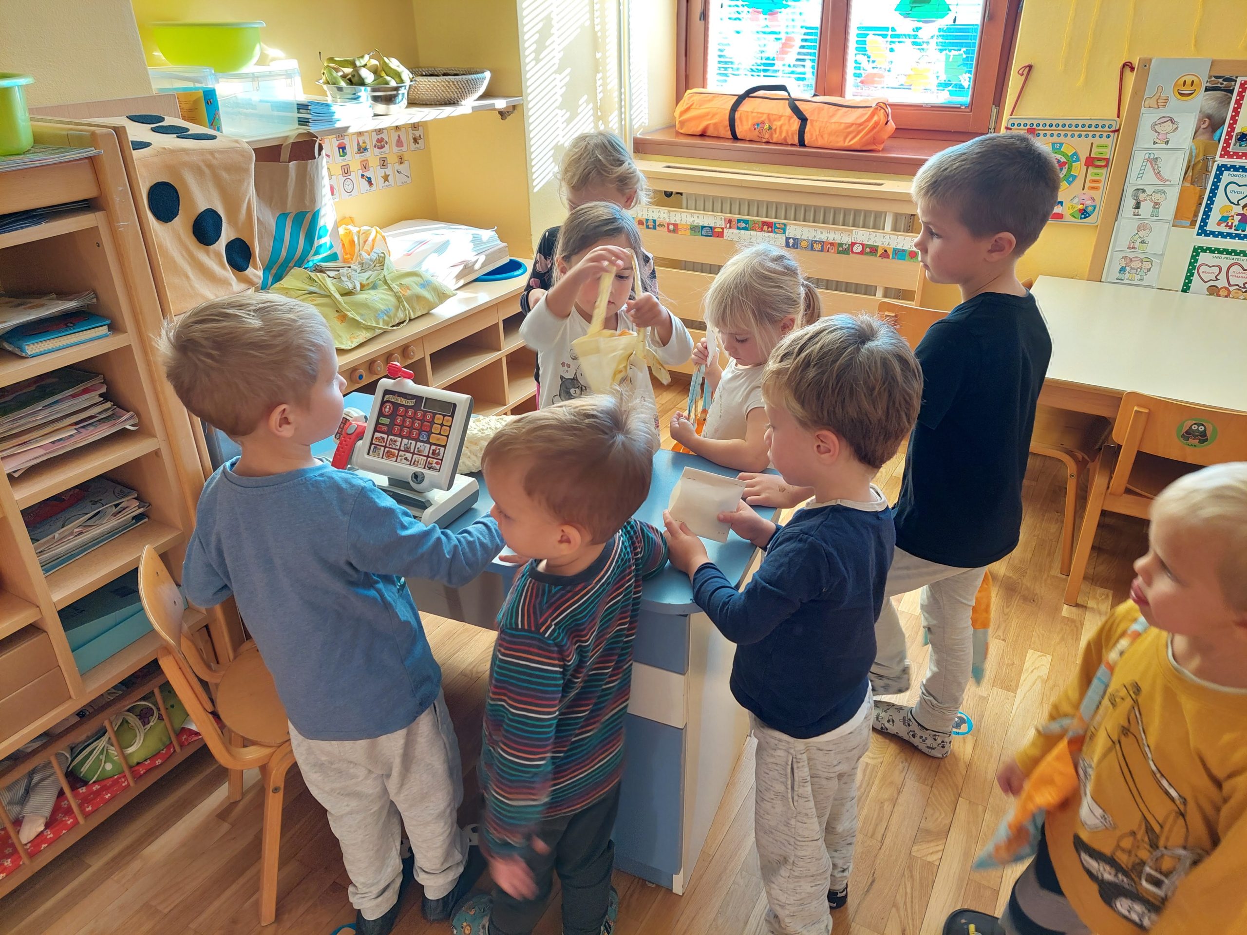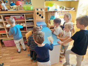 Sreda: Igre z vlogami ( pri zdravniku, v trgovini in na pošti ) s poudarkom na uporabi vljudnostnih izrazov: prosim, hvala, oprosti, želim…