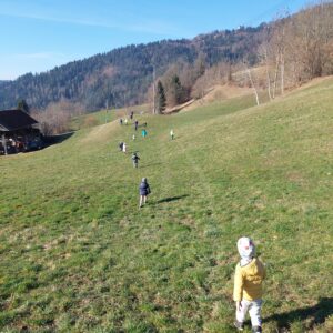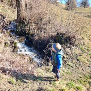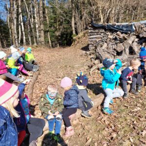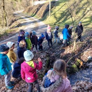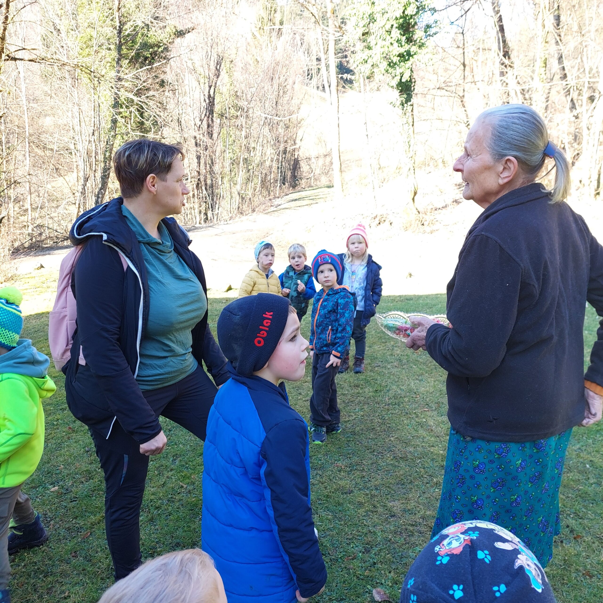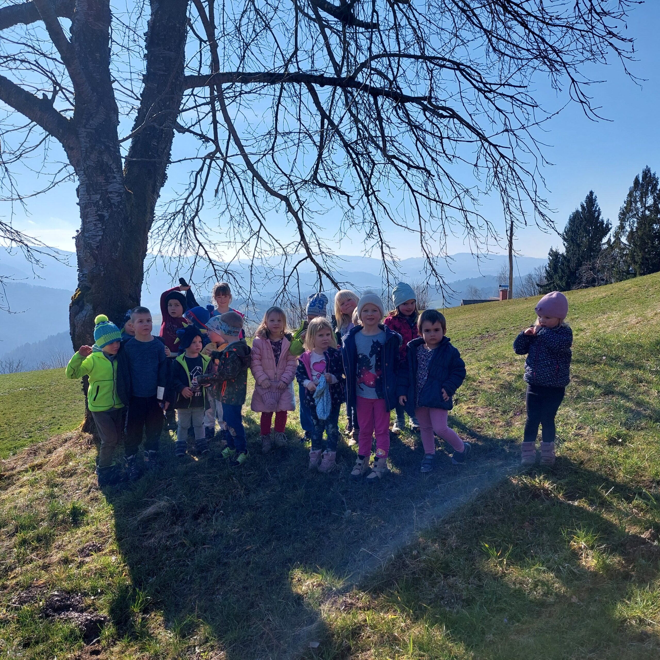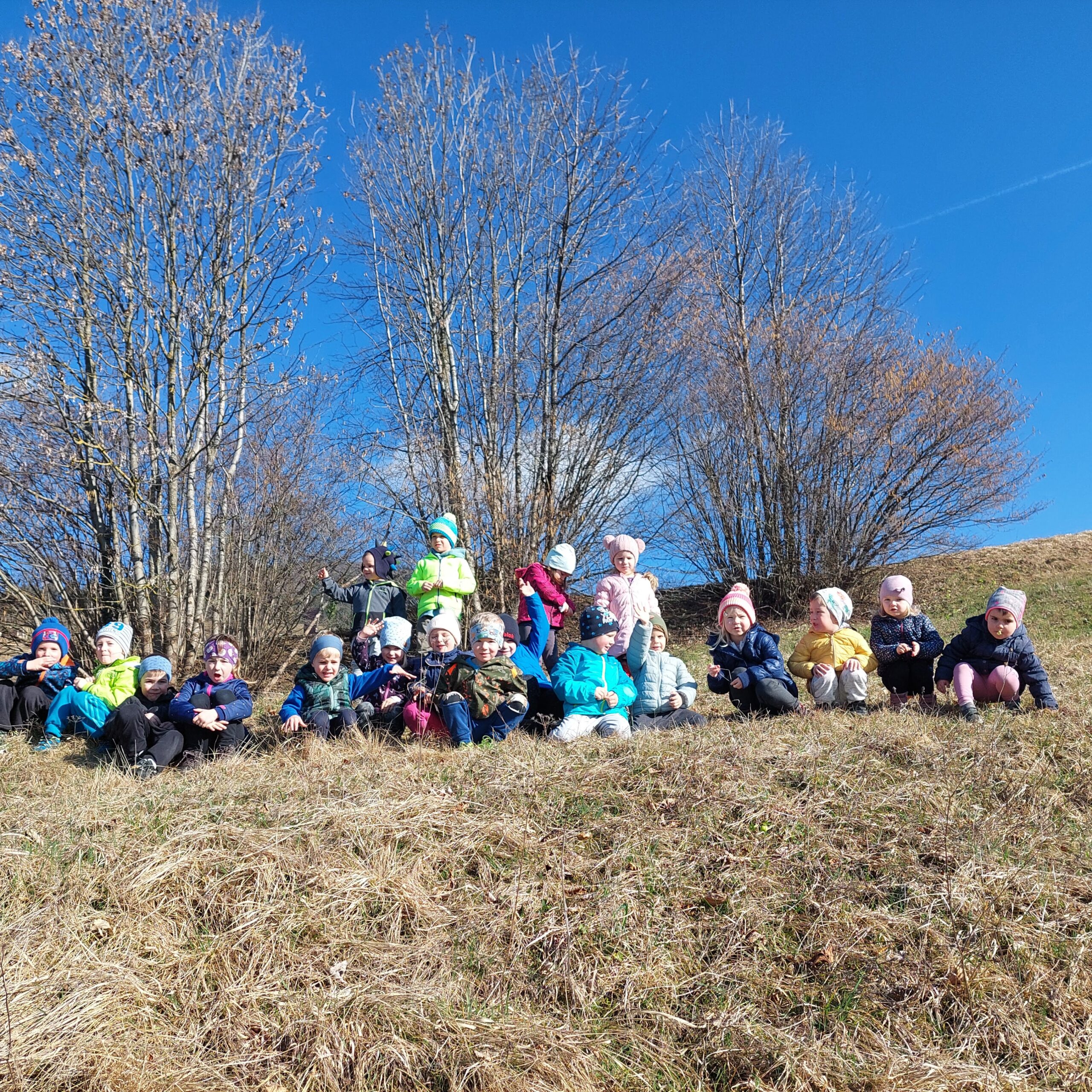 Po daljšem obdobju brez sonca smo komaj čakali, da se ga naužijemo. Danes smo se zato odpravili na zimski pohod za mali sonček, ki pa je bil povsem pomladni:) Na poti smo lahko opazovali pomladne cvetlice in zapiskali na trobentice. Prisluhnili smo pticam v gozdu in od daleč opazovali srno, ki se je podila po travniku. Opazovali in prisluhnili smo bučanju potočka ter se spočili in pomalicali na toplem soncu. Dovolj časa nam je še ostalo za igro v gozdu, nato pa smo se kar čez travnike podali proti vrtcu. Otroci so uživali v sproščeni hoji in teku čez drn in strn. Kljub precej dolgi krožni poti so jo vsi zmogli brez težav. “Komaj čakamo, da gremo spet na pohod!” so dejali otroci.:)