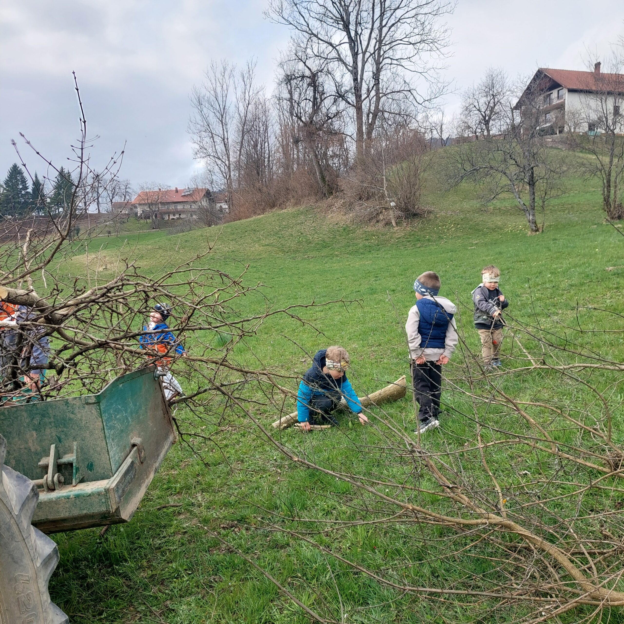 Lepo vreme nas je zvabilo na travnik pod Darmotom, kjer smo se lahko brezskrbno igrali in lovili. Ko pa smo malo bolj natančno pogledali po tleh, smo opazili, da raste vse polno regrata. Naslednji dan, ko smo se spet odpravili na sprehod , smo s seboj vzeli košaro za regrat. Kuhar Matej nam je naročil, naj ga naberemo polno košaro, da ga bomo imeli za kosilo. Otroci so z velikim navdušenjem iskali rastline, vzgojiteljice pa smo jih nato izrezale z nožem. Ker je na travnik prišel Mirko s traktorjem, so se fantje takoj podali k njemu. Kar sami so mu začeli nalagati veje na prikolico in bili pri tem zelo vztrajni. Mirko nam je še pokazal lisičji brlog v skalah pod travnikom. Regratovo solato smo imeli za kosilo. Vsak ga je dobil malo za pokusit, nekaj otrok pa je bilo nad regratovo solato zelo navdušenih.