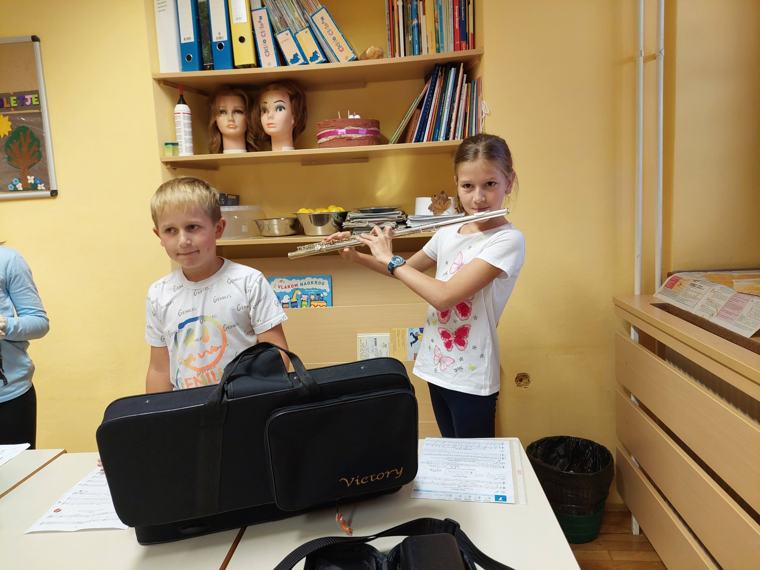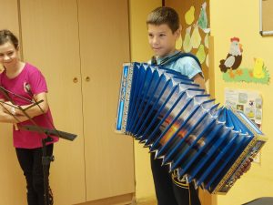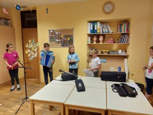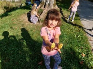 Sreda je minila kot bi mignil. Popestrili so nam jo učenci glasbeniki in nam pripravili pravi mini koncert s predstavitvijo instrumentov. Preostanek dopoldneva smo izkoristili za igro z igračami od doma ter sprehod, kjer smo pri cerkvi nabrali nekaj divjega kostanja, ki ga bomo uporabili za igro in ustvarjanje.